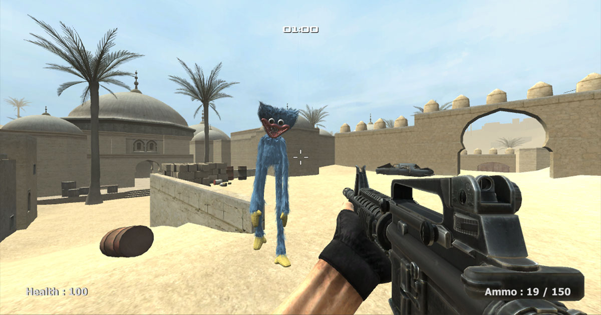 Poppy Strike is a 3D shooting game which features gun game mode with big arsenal of weapons and famous dust 2 map crowded with huggy wuggy, your mission is to shoot all incoming huggy wuggy and try to survive by the end of each round in order to get new weapons.